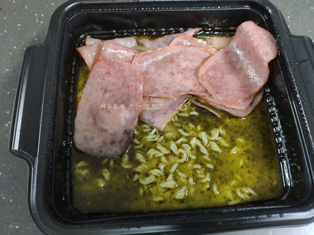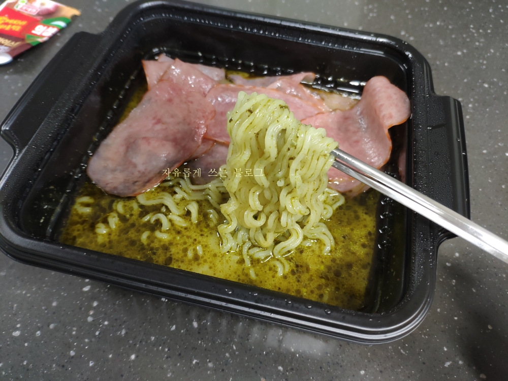 용기에 슬리브를 끼워 전자레인지에 3분 30초 정도 돌린 후, 바질페스토를 넣고 슬라이스햄을 곁들여 먹으면 된다고 해요.