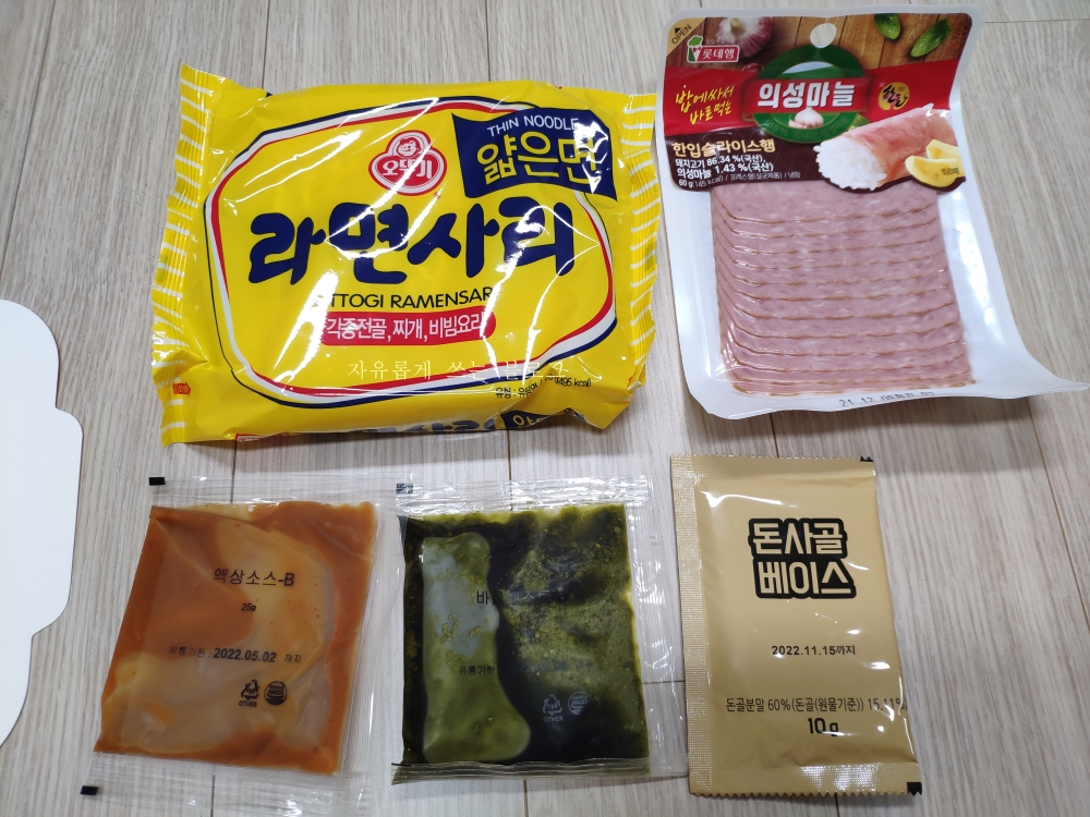 라면사리와 의성마늘 한입슬라이스햄, 바질페스토, 돈사골 베이스 등으로 구성이 되어 있어요.