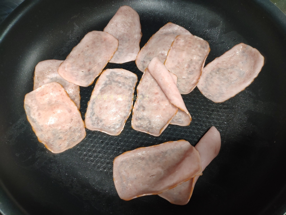 전자렌지에 돌리는 동안 의성마늘햄은 프라이팬에 살짝 구워줬습니다. 왠지 차가운 상태로 그냥 먹고 싶지가 않더라구요.^^;;