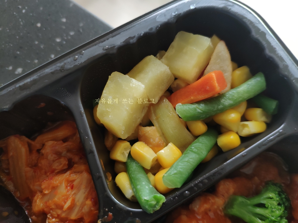 한쪽에는 채소 믹스(?) 같은 것도 들어 있었는데요, 고구마, 그린빈, 당근, 옥수수 등으로 구성되어 있습니다.
