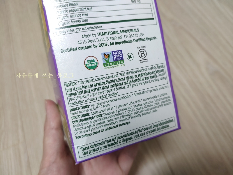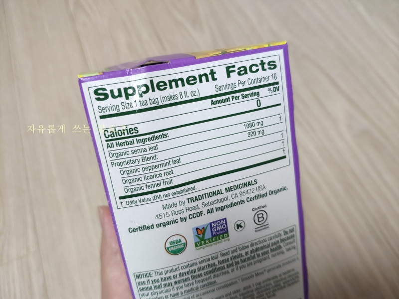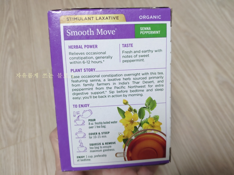 성분을 보면 유기농 센나 잎이 주 성분이고, 유기농 페퍼민트잎, 유기농 감초 뿌리, 유기농 회화 열매 등이 함께 배합되어 있습니다.