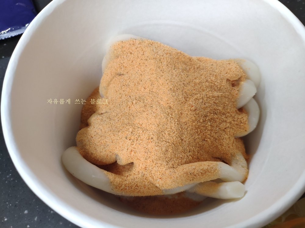 먼저 용기에 떡과 분말스프, 요리수를 넣고 잘 섞어주었어요. 떡이 약간 딱딱한 상태라 골고루 잘 저어주기가 생각보다 어렵더라고요.