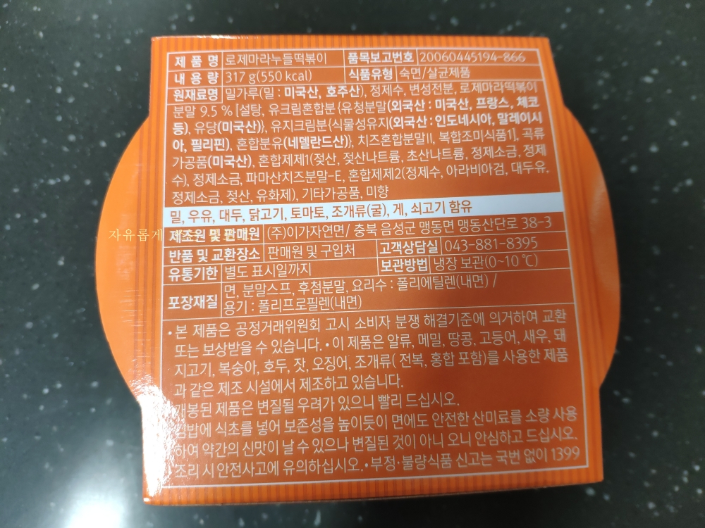 조리방법은 용기에 떡면, 분말스프, 요리수를 넣고 잘 섞은 다음 종이케이스를 끼워 전자레인지에 4분 30초 (700w기준) 돌려주면 됩니다.