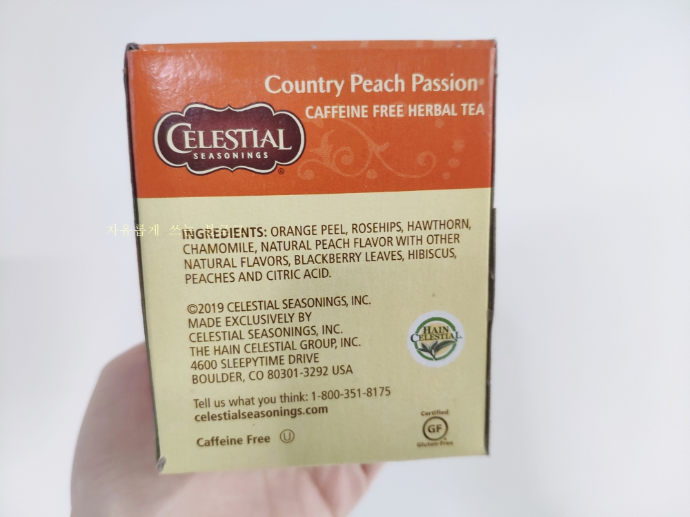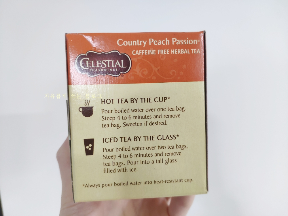 아래 사진 속 제품이 바로 '셀레스티얼 시즈닝 (celestial seasonings)' 브랜드의 '컨트리 피치 패션 허브티(Country Peach Passion)'입니다. :)