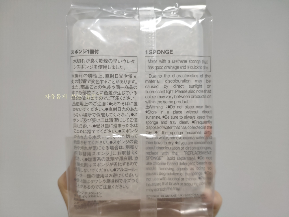 우레탄 스폰지 + 받침으로 구성된 비누받침입니다. 주의사항을 읽어보니 화기나 직사광선을 피하고, 트레이를 항상 깨끗하게 유지하라고 되어 있더라고요.