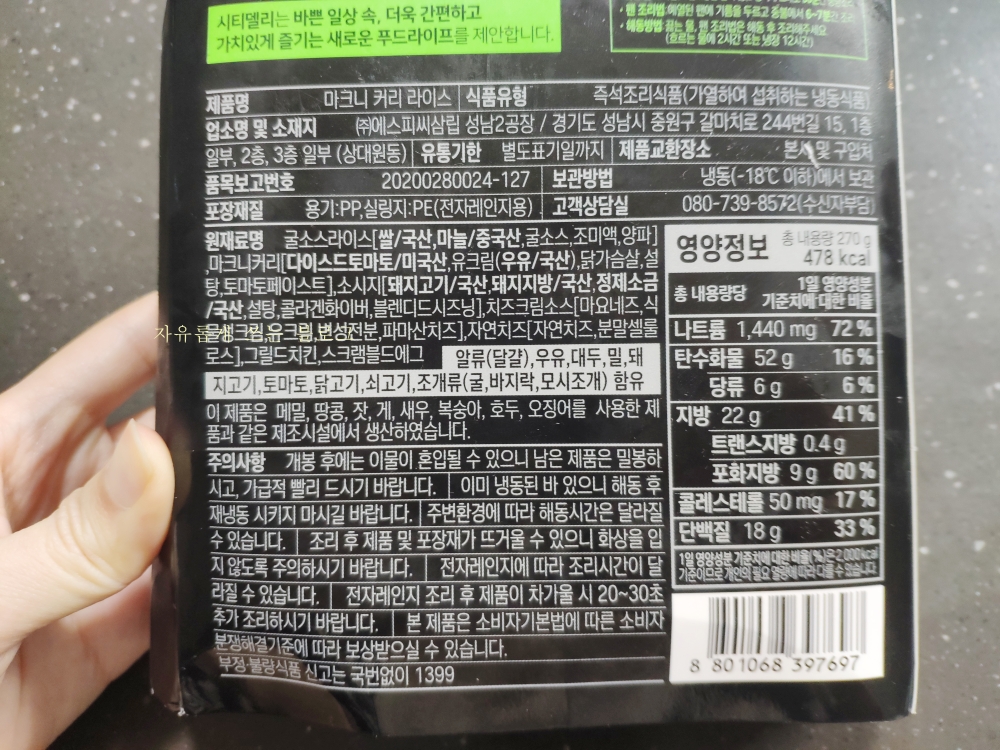 뒷면에는 시티델리 브런치앳홈 마크니 커리 라이스 원재료명과 영양정보 등이 상세히 나와 있습니다.