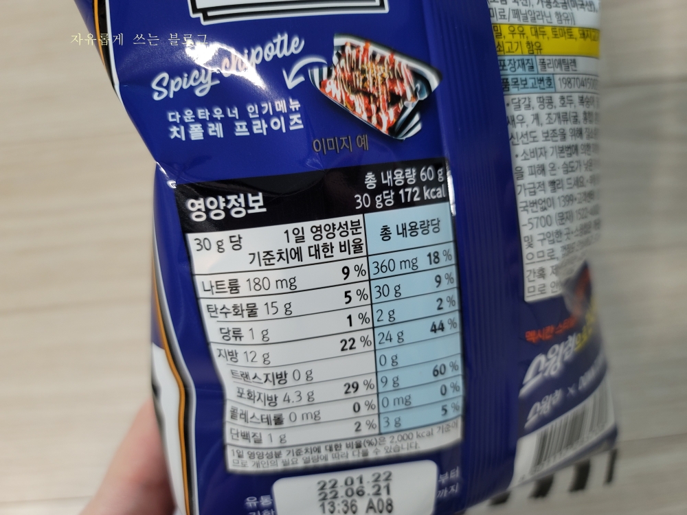 1봉에 총 60g의 감자칩이 들어 있으니 한 봉을 다 먹으면 344kcal를 섭취하게 됩니다.