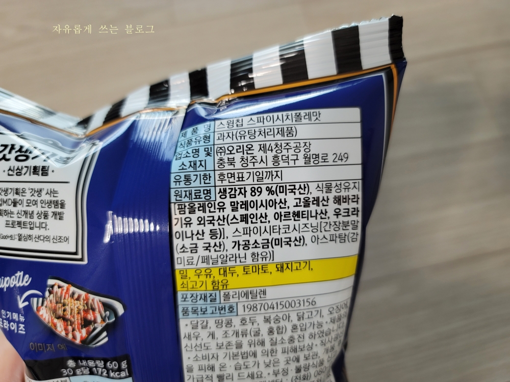 스윙칩 다운타우너 스파이시 치폴레맛에는 생감자 89%와 할라피뇨분말 0.0001%가 들어갔다고 합니다.