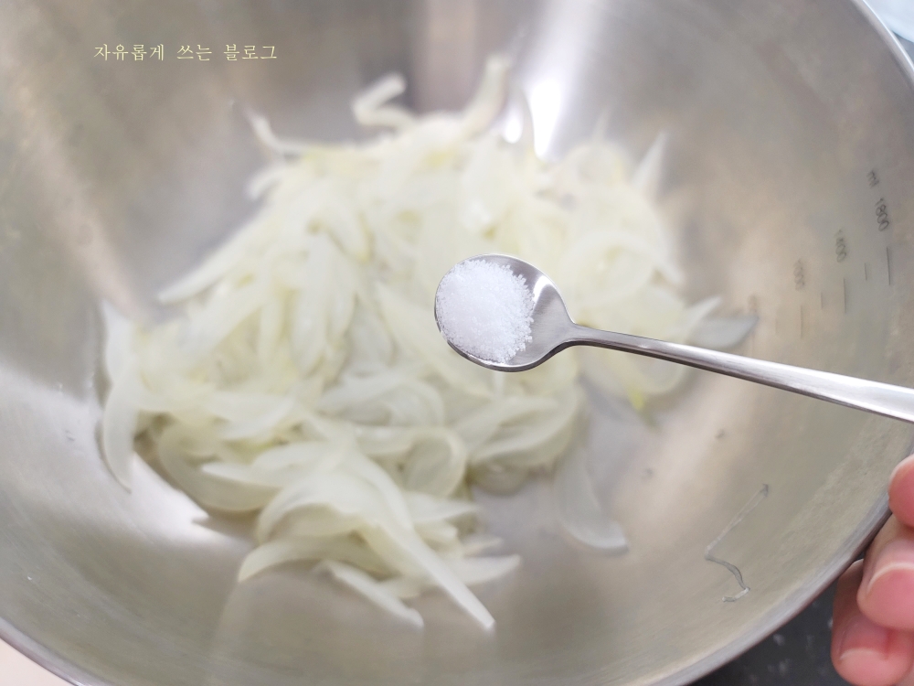 먼저 양파를 얇게 채 썰어줍니다. 저는 양파 반 개 정도 사용했어요.