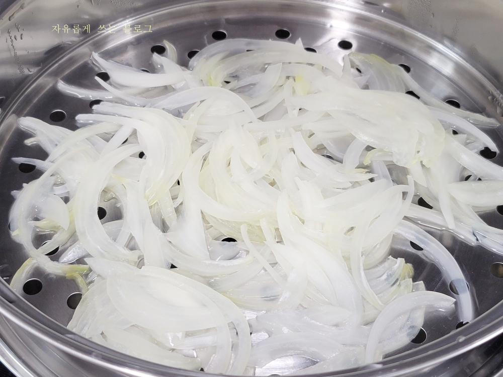 김이 오른 찜기에 채 썬 양파를 올려줍니다.