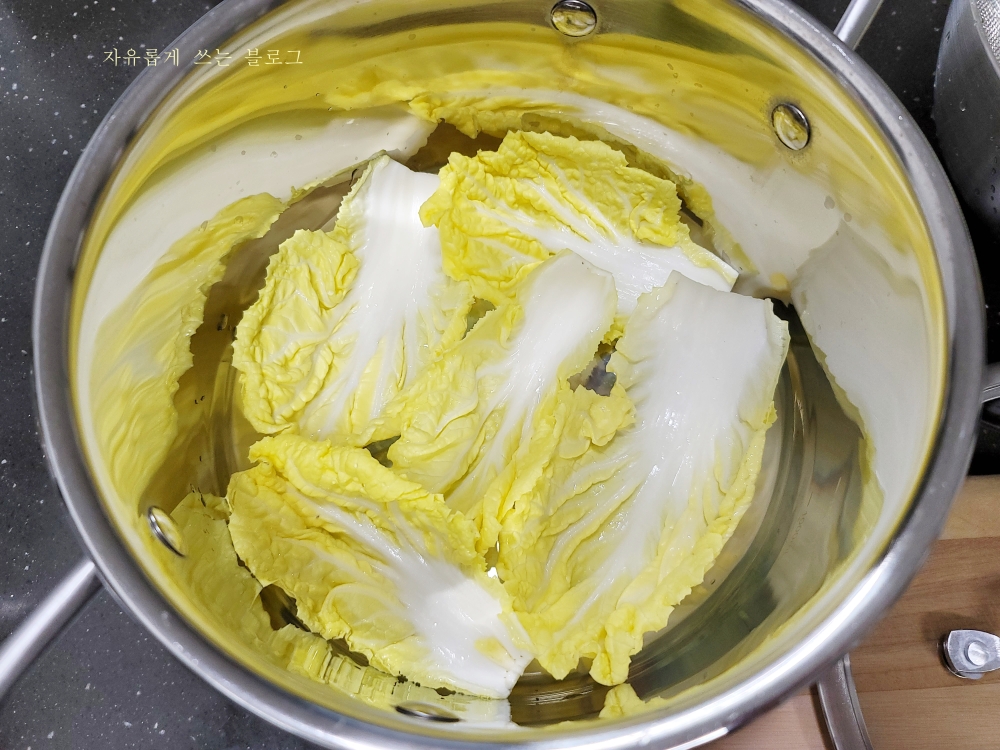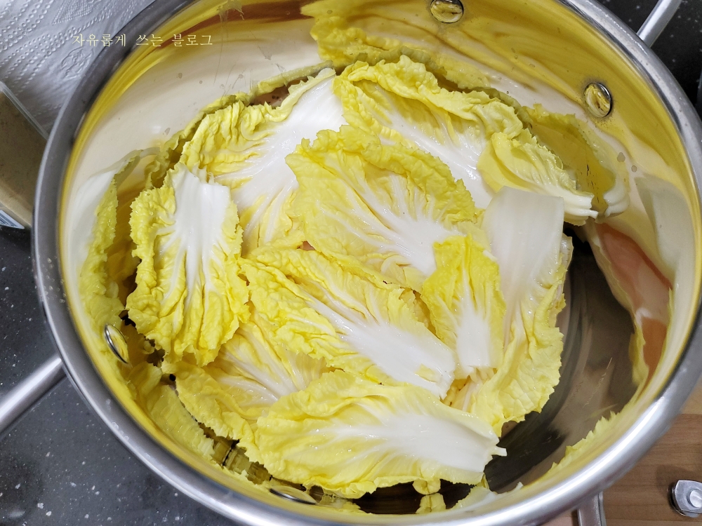 냄비 바닥에 알배추 잎을 골고루 잘 깔아줍니다.