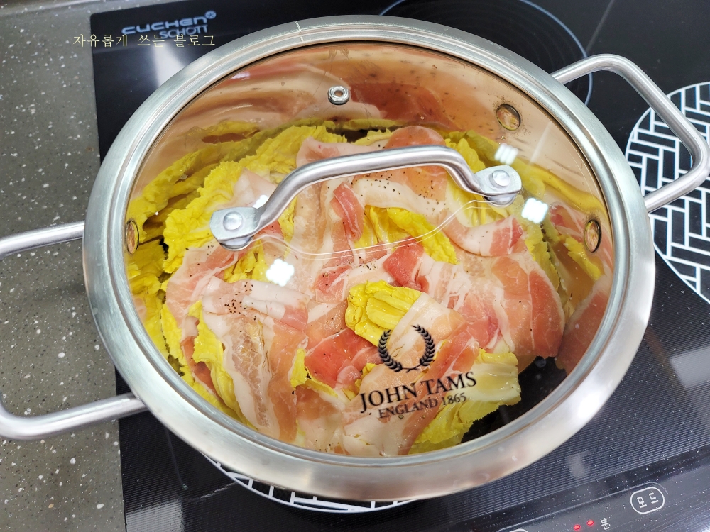 약 20분 뒤... 배추와 고기가 다 익은 모습입니다. 배추가 숨이 죽어 푹~꺼진 모습이네요.ㅎㅎ