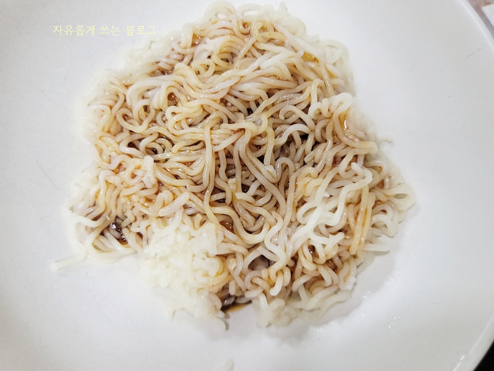 조리법대로 4분간 면을 삶은 뒤, 냉수로 차갑게 만들어 주었어요. 그리고 물기를 빼 접시에 담고 비빔소스, 참기름을 뿌려주었습니다.