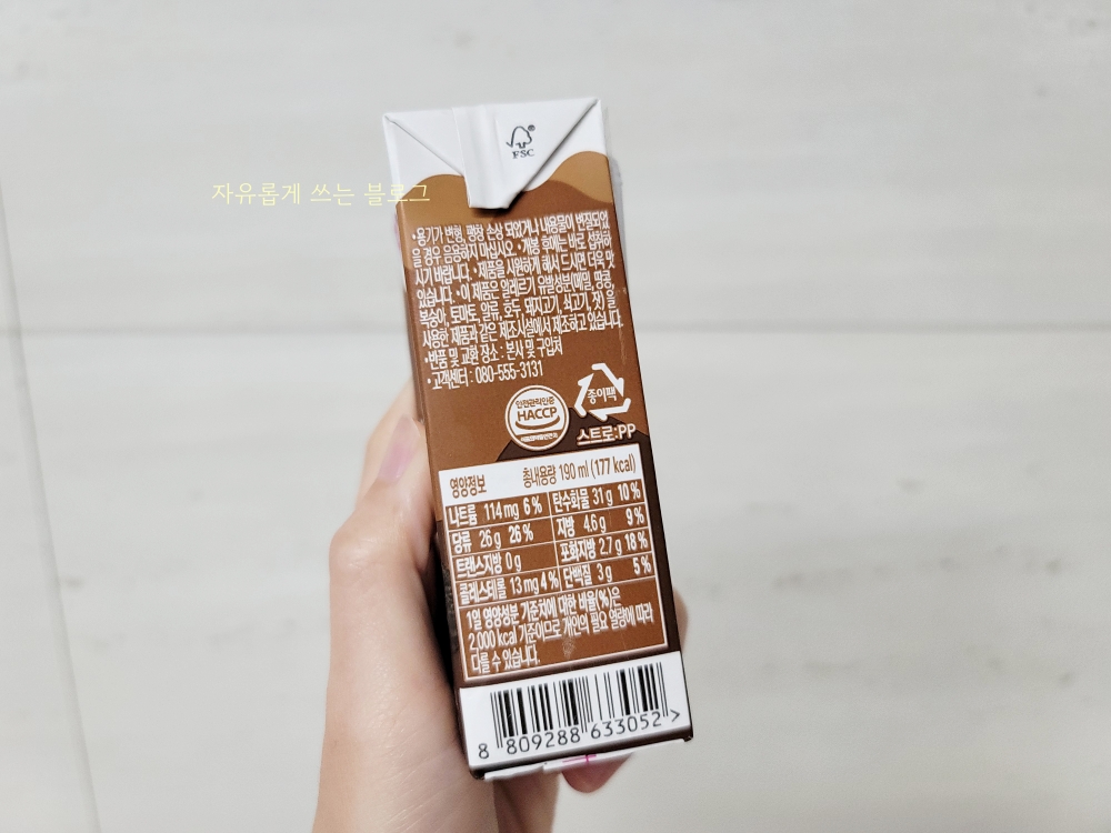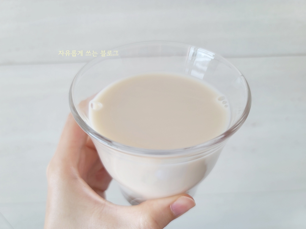 마찬가지로 투명한 유리컵에 담아본 모습이에요. 베리베리 스트로베리 우유와는 다르게 초코스러운(?) 색상을 띠고 있네요.
