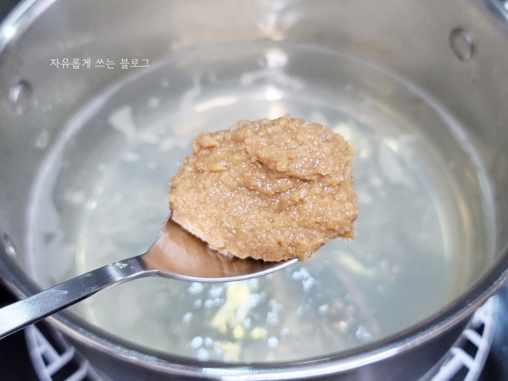 전 육수 약 1리터 정도에 된장 1.5큰술 정도 넣어준 것 같아요. 집마다 된장 염도가 다르기 때문에 맛을 봐가며 적당히 조절해주시면 됩니다.