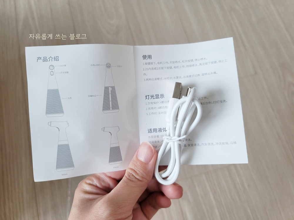 구성품이에요. 스프레이 본체와 충전 잭, 그리고 설명서가 함께 들어 있습니다.