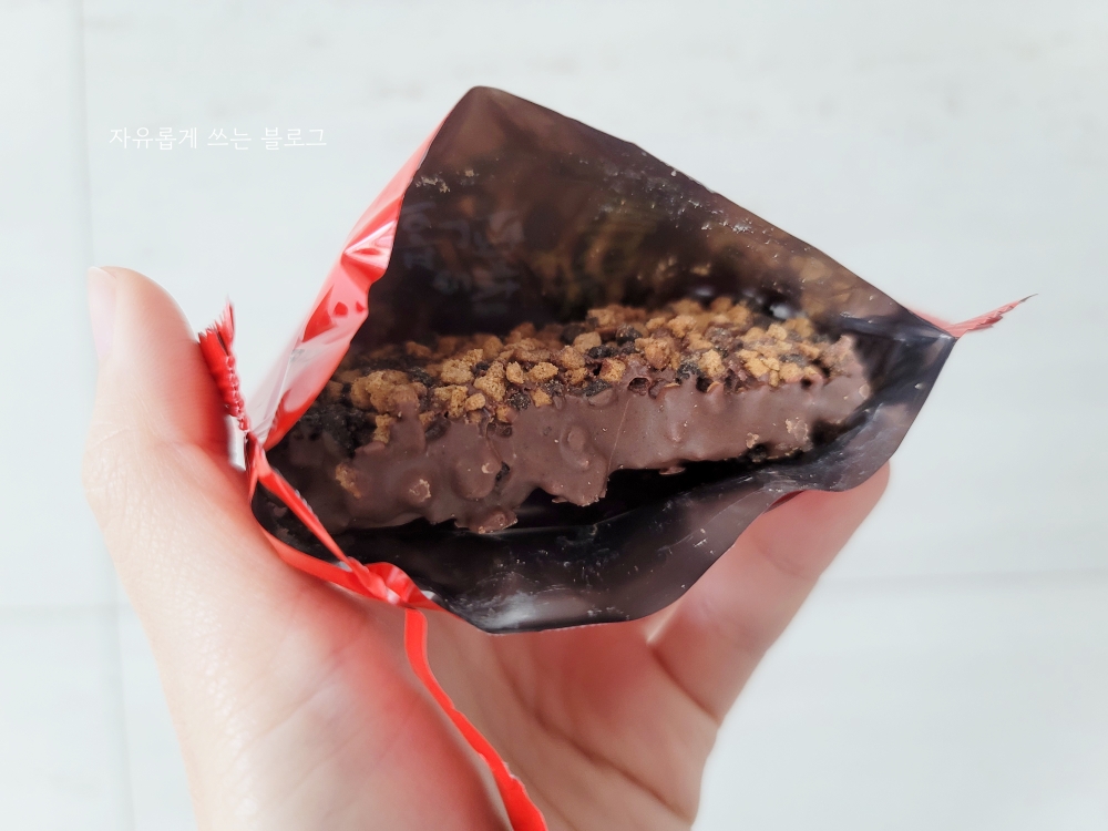 포장을 뜯어보니 돼지바를 연상시키는 딱 그 비주얼이네요.ㅎㅎ 겉 부분에 초콜릿이 묻어 있고, 여기에 바삭한 쿠키 칩이 한번 더 묻어있는 비주얼입니다.