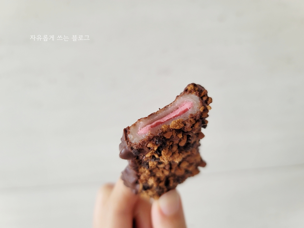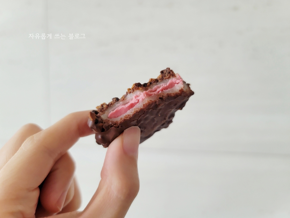 초콜릿의 달달한 맛과 함께 중간에 들어있는 딸기 크림의 상큼한 맛도 함께 느껴지더라고요. 초코 + 딸기의 조합이라 아이스크림으로 된 돼지바를 먹을 때와 비슷한 맛이 납니다.