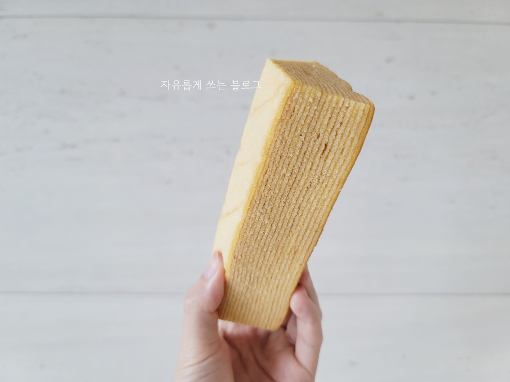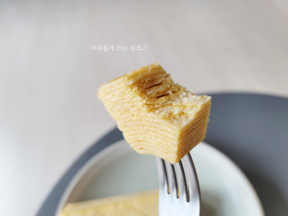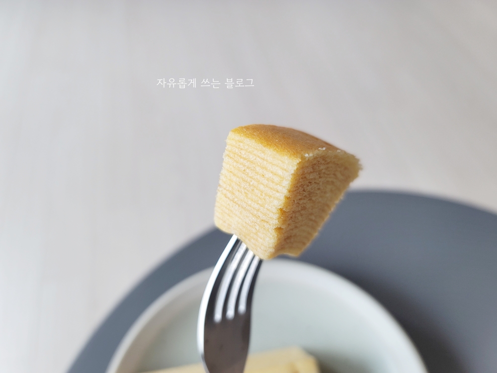 맛을 보니 일단 식감은 부드러우면서 살짝 폭신폭신한 느낌이 듭니다. 카스테라와 비슷한 듯 하면서도 조금 다른 느낌이에요.