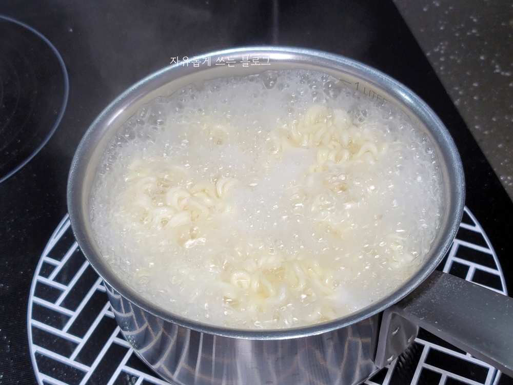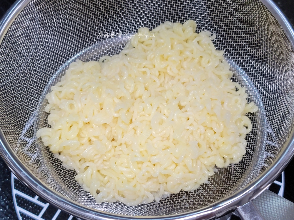 잘 삶아진 라면사리는 일단 체에 밭쳐두었어요.