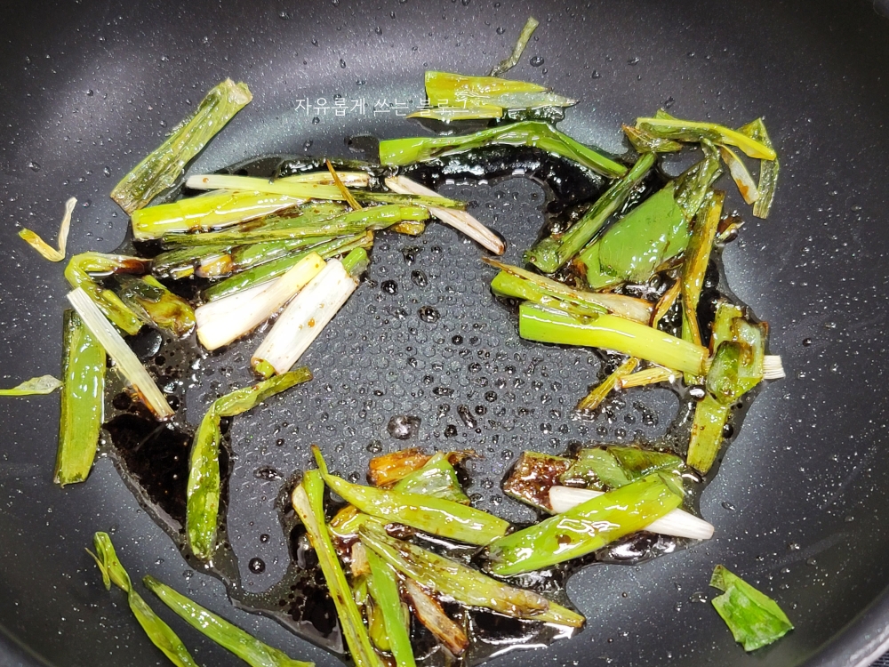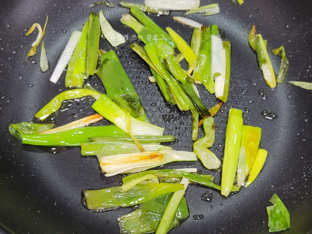 팬에 식용유를 넉넉히 두르고 손질한 대파를 넣어 볶아줍니다.