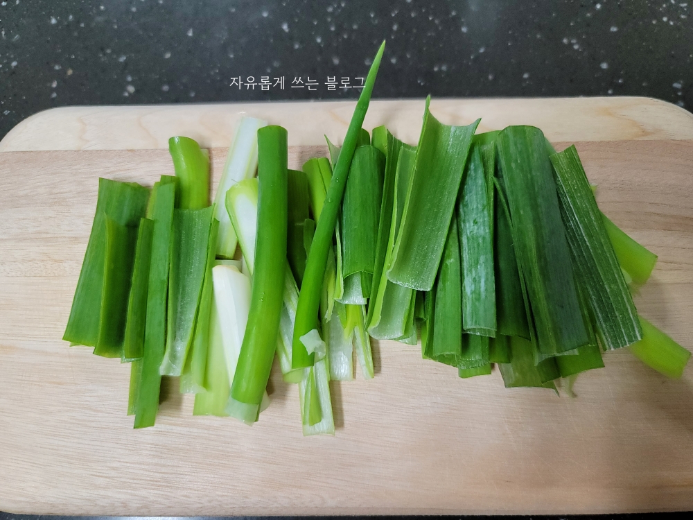 먼저 대파는 세로로 길게 2등분한 뒤, 적당한 크기(손가락 길이 정도..?)로 잘라 손질해 주었습니다.