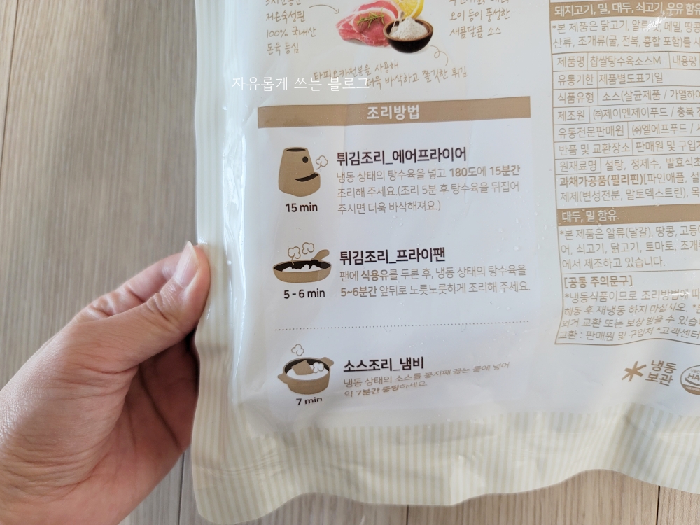 조리 방법은 매우 간편한데요, 에어프라이어를 사용할 경우 냉동 상태의 탕수육을 넣고 180도에서 약 15분간 조리해주면 됩니다.