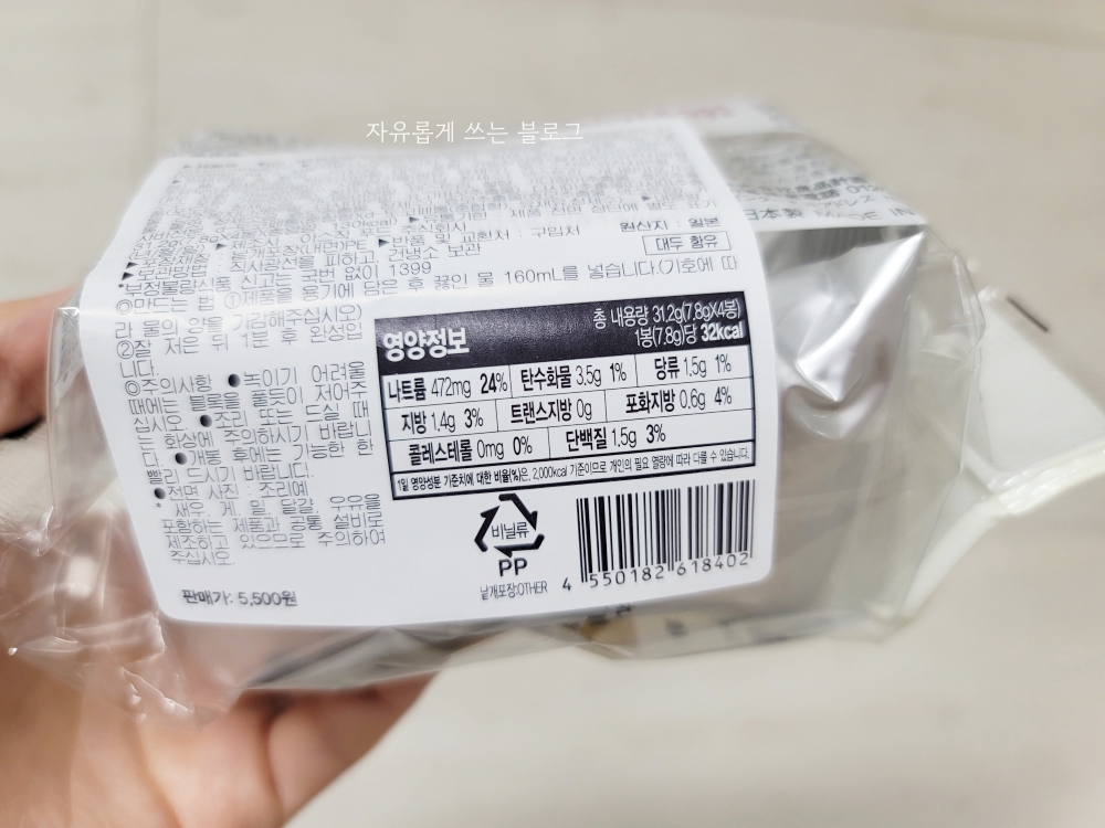 국 종류이다보니 칼로리는 크게 높지 않아요. 1인분(7.8g) 당 열량은 32kcal입니다.