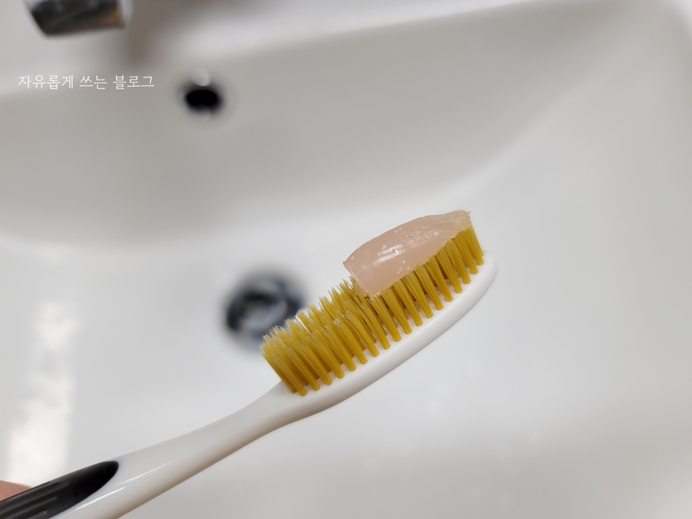 칫솔에 약간 덜어본 모습입니다. 반투명하면서 핑크핑크한 색상을 띠고 있어요.