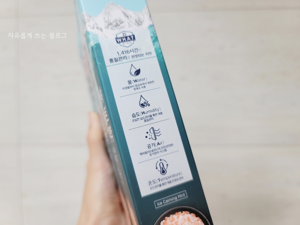 포장 한쪽에는 긴 시간의 품질관리로 만들어지는 치약이라는 문구가 보입니다.