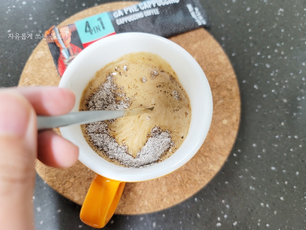 들어가는 물 양은 비슷한데 평소 마시는 믹스커피보다 가루 양(?)이 많은 느낌이랄까요.