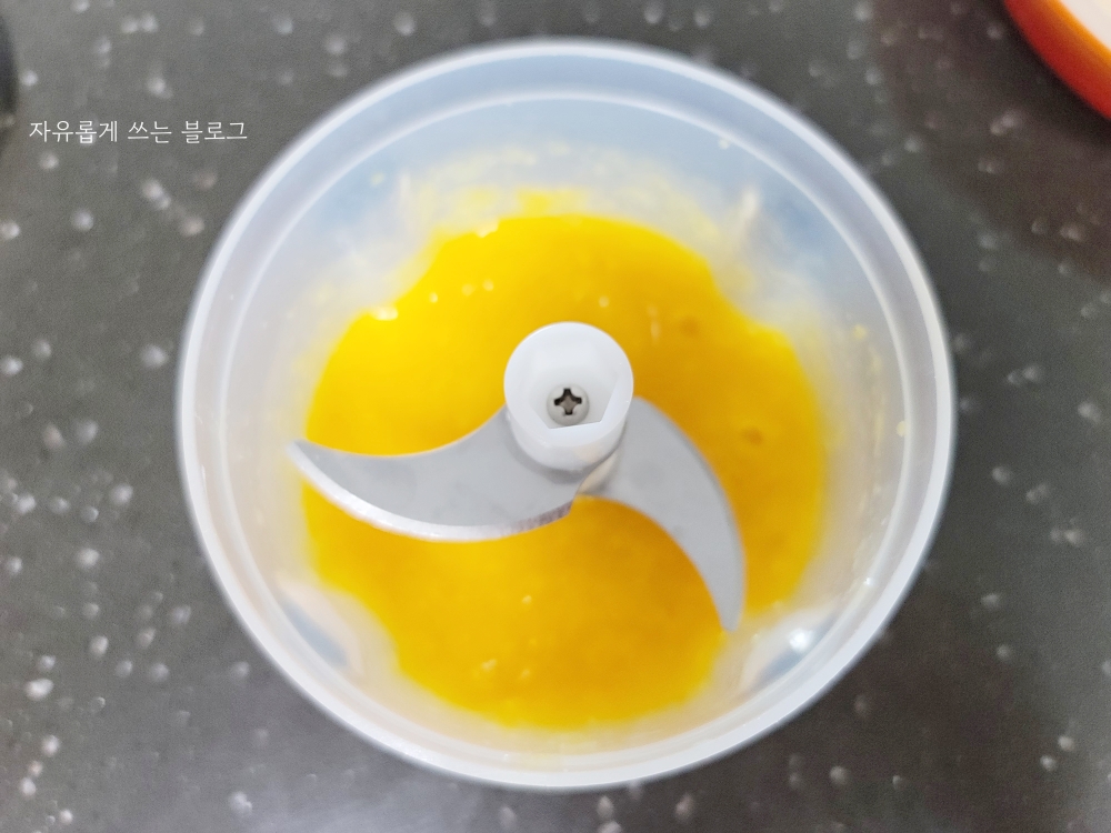 살짝 해동한 냉동망고를 믹서에 넣어 갈아줍니다. 예전에 직구로 구매했던 마늘다지기 겸 미니믹서를 사용했어요.