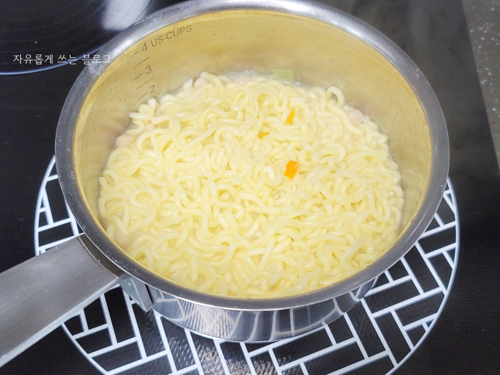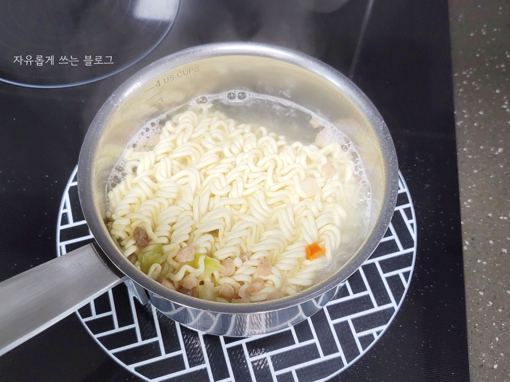 물이 끓길래 면을 넣고 끓여주었습니다. 5분 정도 익혀주면 됩니다.