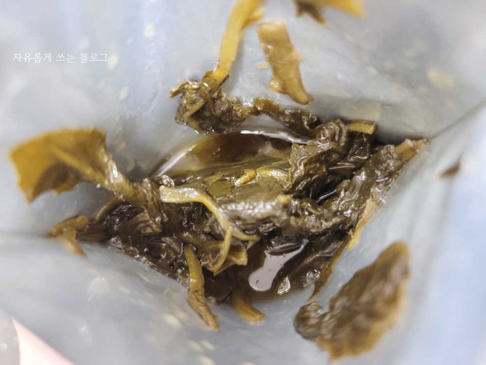 포장을 뜯어 내부를 살펴본 모습입니다. 약간 묽은 느낌의 소스와 함께 곤드레나물이 담겨 있네요. 소스에서는 고소~한 향이 나고요.
