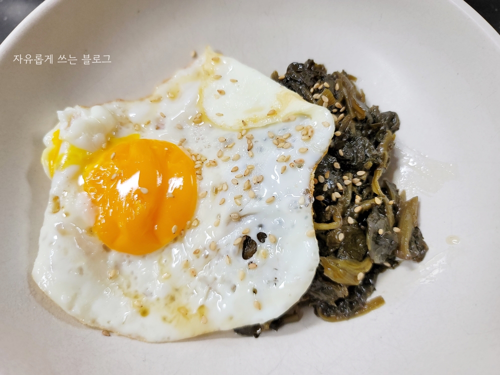 여기에 달걀 프라이 1개를 얹고, 통깨 솔솔, 참기름 약간을 넣어주기만 하면 초간단 곤드레 나물 비빔밥 완성입니다.