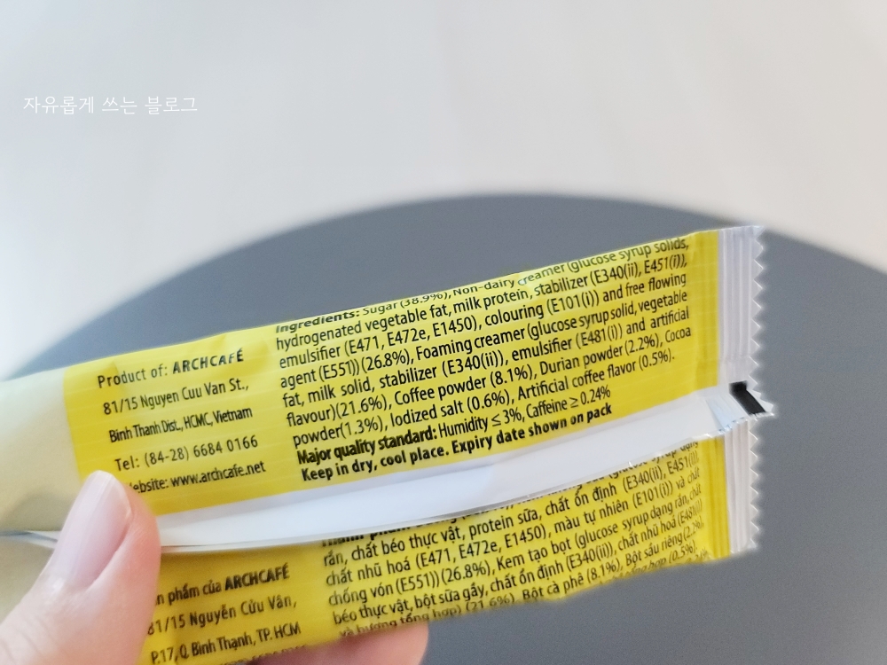 원재료명을 자세히 살펴보니 ‘두리안 파우더’가 들어가 있는 것이 보입니다. 단순히 향만 첨가한 것이 아닌, 찐 두리안 카푸치노네요.ㅋㅋ