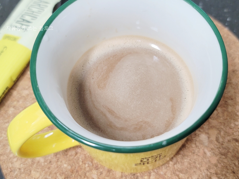 뜨거운 물을 부어 잘 저어준 모습이에요. 뜨거운 물을 부으니 두리안 향이 좀 더 진하게 느껴지는 것 같기도 하네요.^^;;