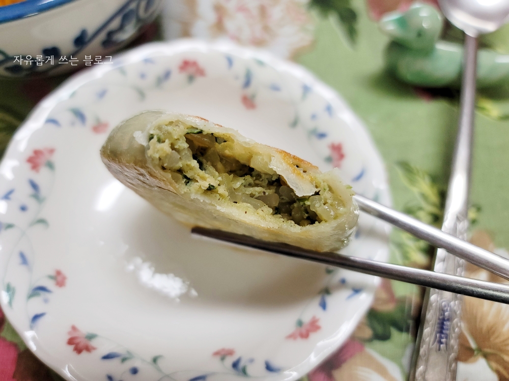 한입 베어 맛을 보니 일단 만두피 식감이 꽤 괜찮습니다. 쌀가루가 들어가서인지 바삭하면서도 쫄깃한 식감이 참 좋더라고요.