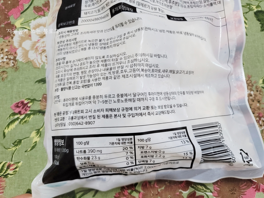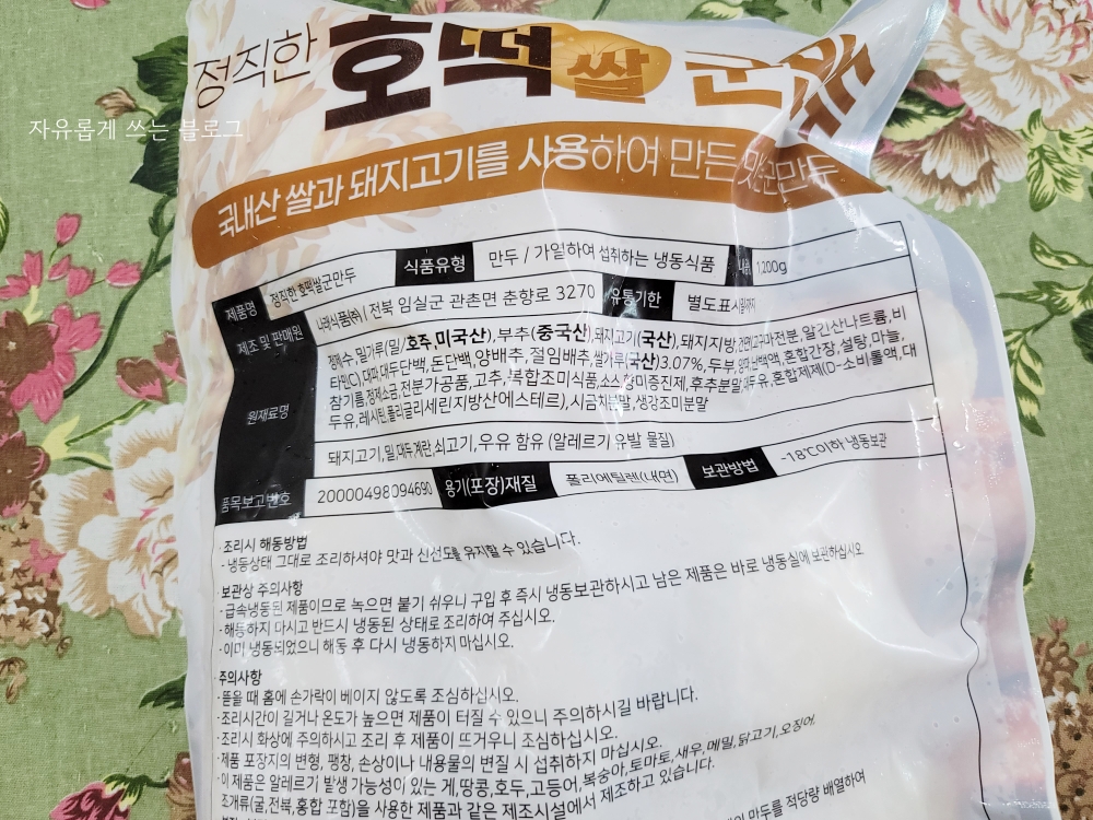 원재료명이 있는 부분도 찍어보았습니다. 부추, 돼지고기, 대파, 양배추 등이 보이네요.