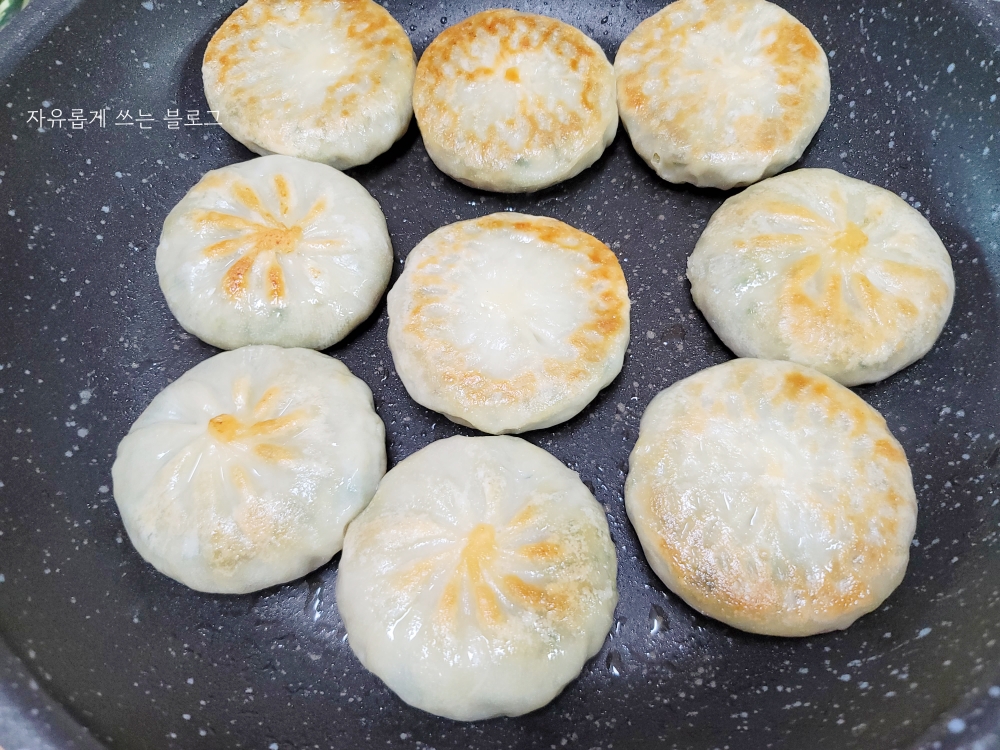 앞뒤로 노릇노릇해질 때까지 열심히 구워 주었습니다. 요즘 날씨가 덥다 보니 겨우 10분 남짓 만두를 구웠을 뿐인데도 땀이 주르륵 흐르더라고요.ㅜㅜ