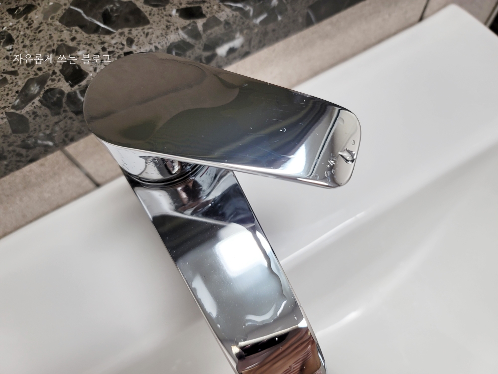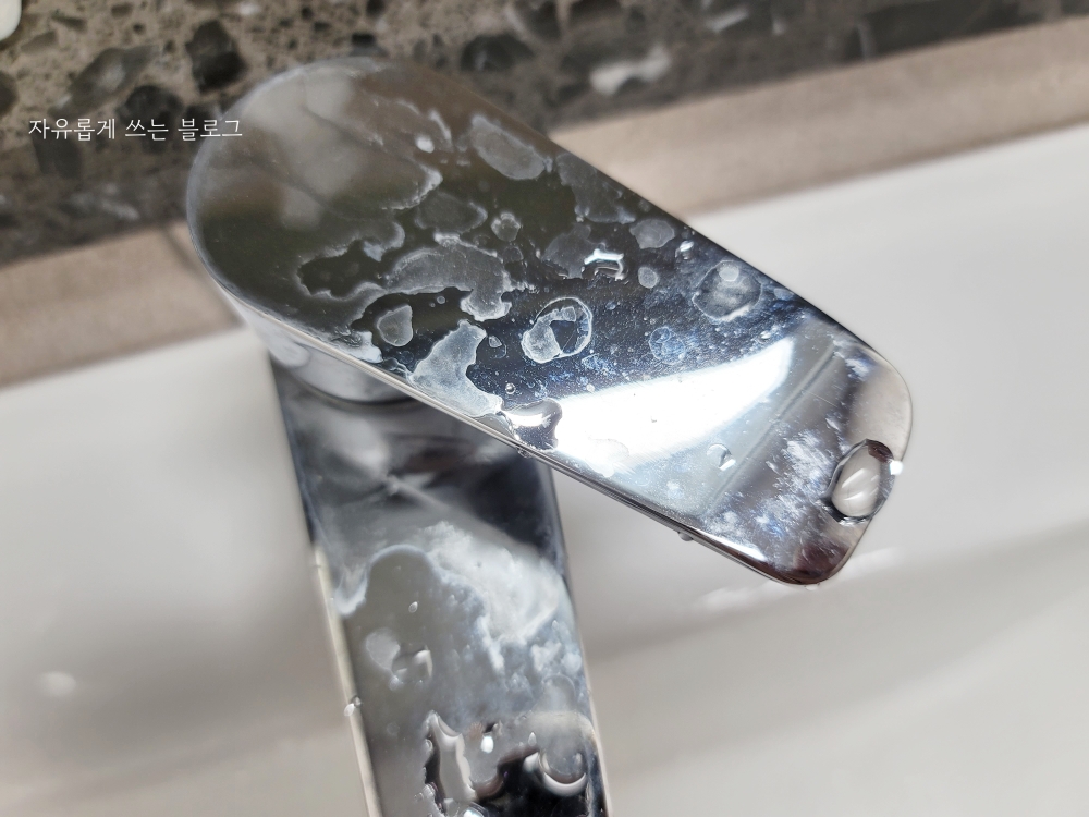 화장실 세면대에 있는 수도꼭지인데 하얗게 물때가 끼어 있는 모습이 보이네요. 특히 가장자리 부분에 있는 물때는 아무리 문질러도 잘 지워지지가 않더라고요.😭