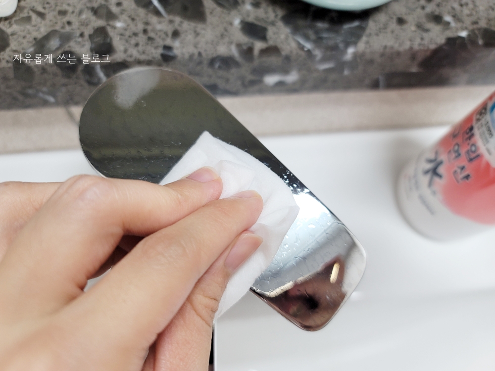 한입 구연산수를 칙칙 뿌려 준 뒤, 물티슈를 이용해서 문질러 주었습니다. 그랬더니 거짓말처럼 물때가 싹~ 사라지더라고요.