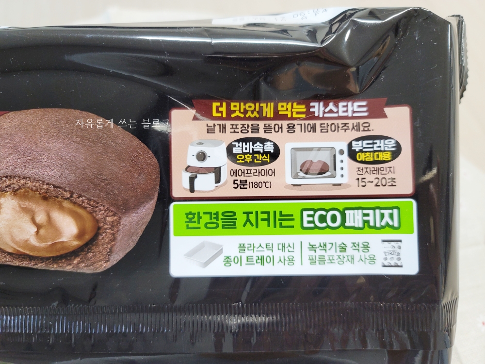 포장 한쪽에는 카스타드를 더 맛있게 먹는 방법에 대해서도 적혀 있었는데요, 에어프라이어에 돌리면 겉바속촉한 느낌이 된다고 하네요.