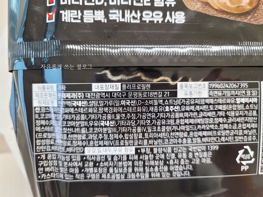 까망 카스타드 더블초코에는 비타민 D, 비타민 E가 들어있어 영양까지 챙겼다고 해요. 계란과 국내산 우유도 사용되었다고 합니다.