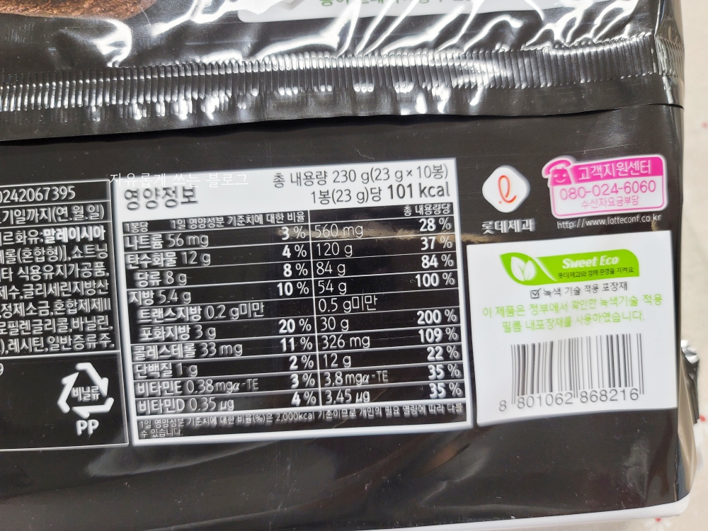 영양 정보가 적혀있는 부분도 찍어 봤어요. 한 봉당 23g이고, 칼로리는 101kcal라고 적혀 있네요.