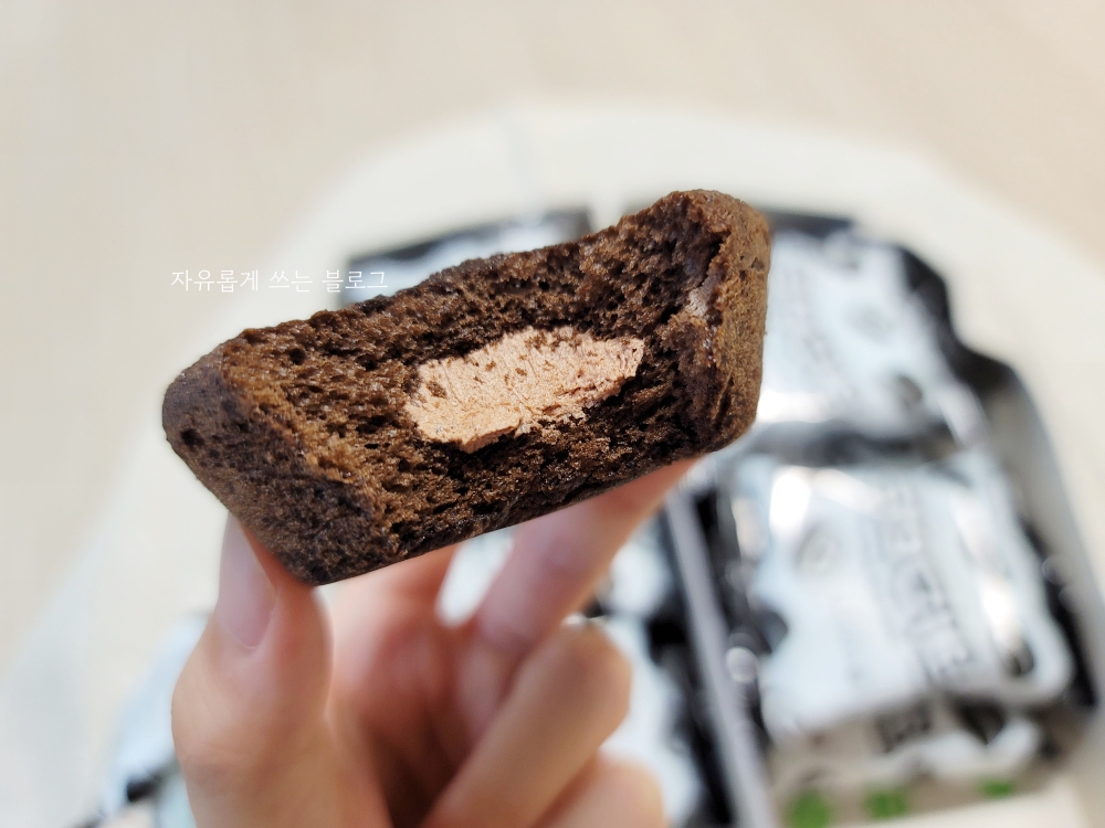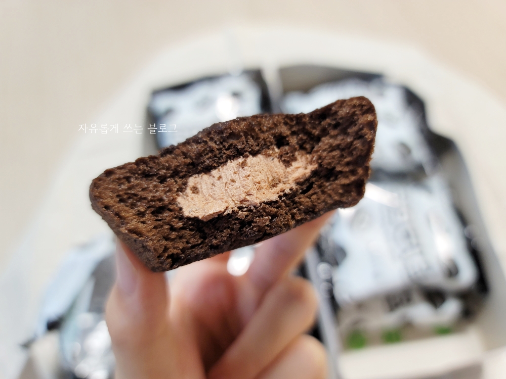 입에 넣자마자 초코 향과 함께 부드러운 식감이 느껴집니다. 카스타드답게 입안에서 살살 녹는 부드러운 식감이 그대로 느껴져요.