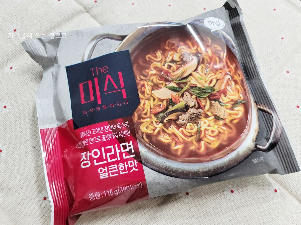 아래 사진 속 제품이 바로 더미식 장인라면 얼큰한맛입니다. 닭고기 회사로 잘 알려진 하림에서 나온 라면이에요.