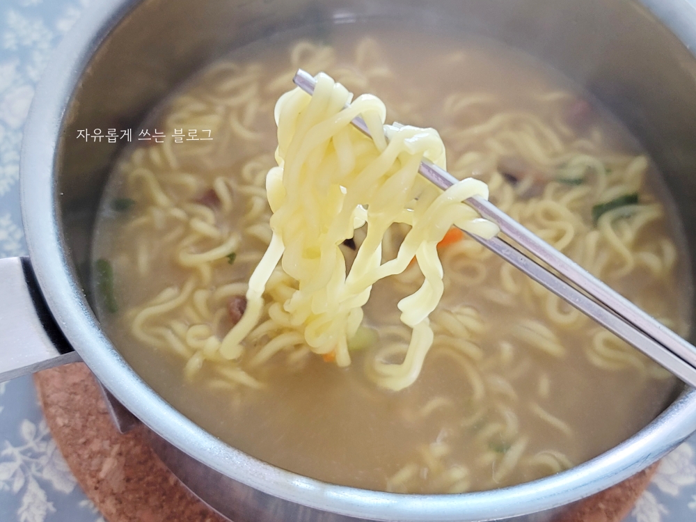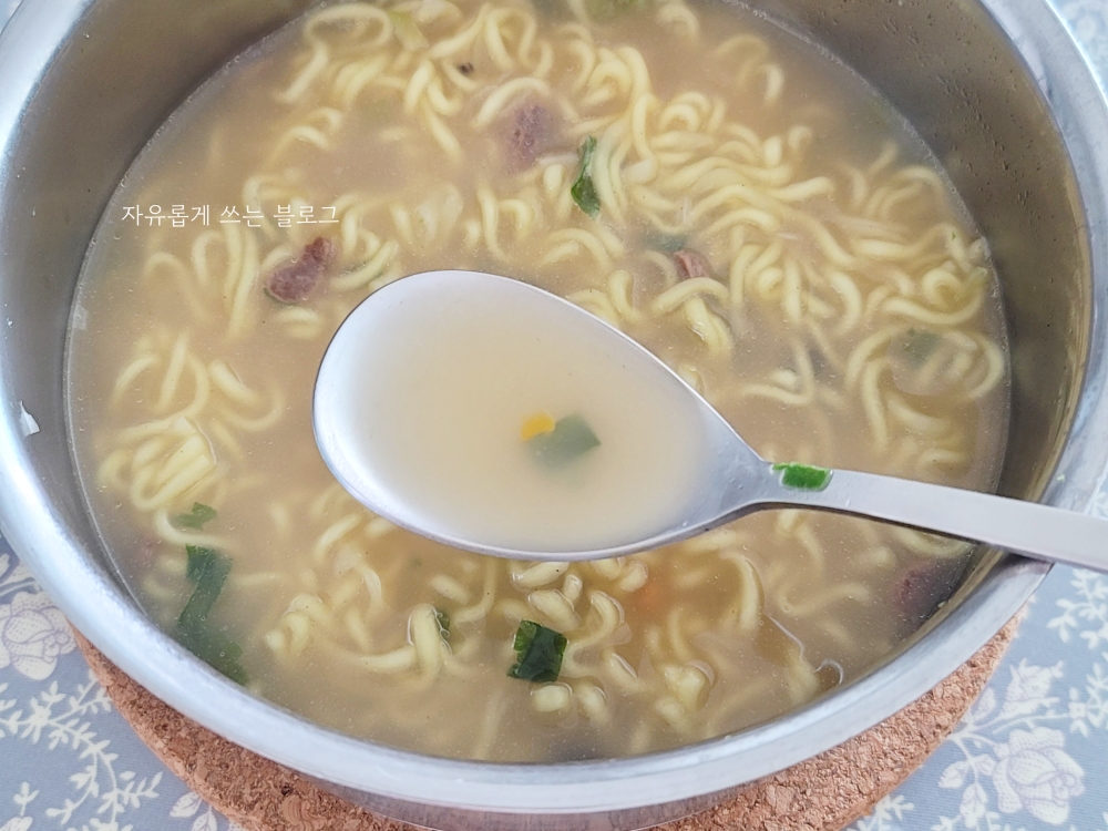 포장에 있는 라면 국물 색깔처럼, 뽀얀 국물 스타일의 라면이에요.