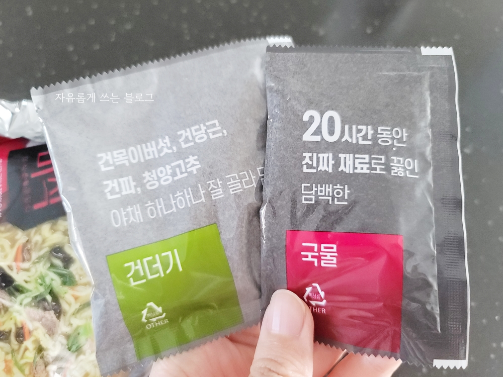 건더기도 목이버섯, 파, 대두단백후레이크(?) 등 심심하지 않게 들어 있어 좋았네요.