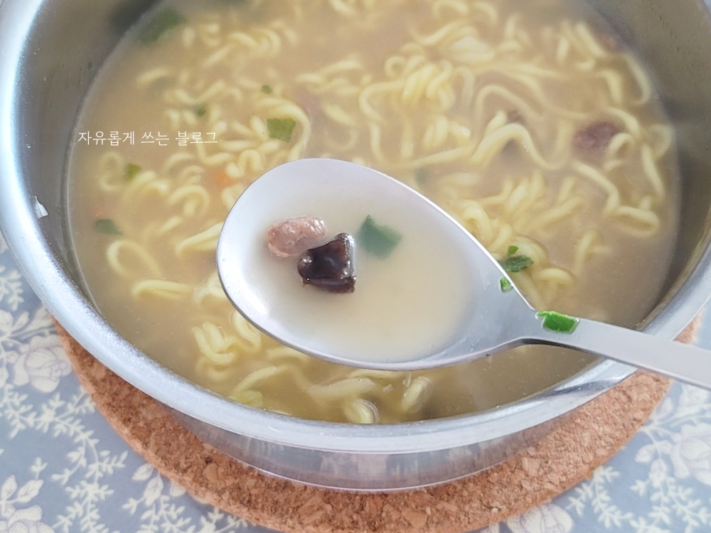 더미식 장인라면 담백한맛은 닭고기, 사골, 돈골, 버섯을 황금비율로 고아낸 뒤, 청양고추, 무, 대파로 시원함을 잡았다고 합니다.